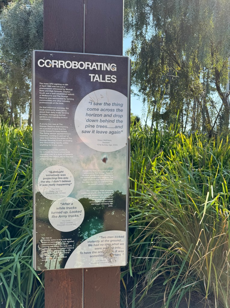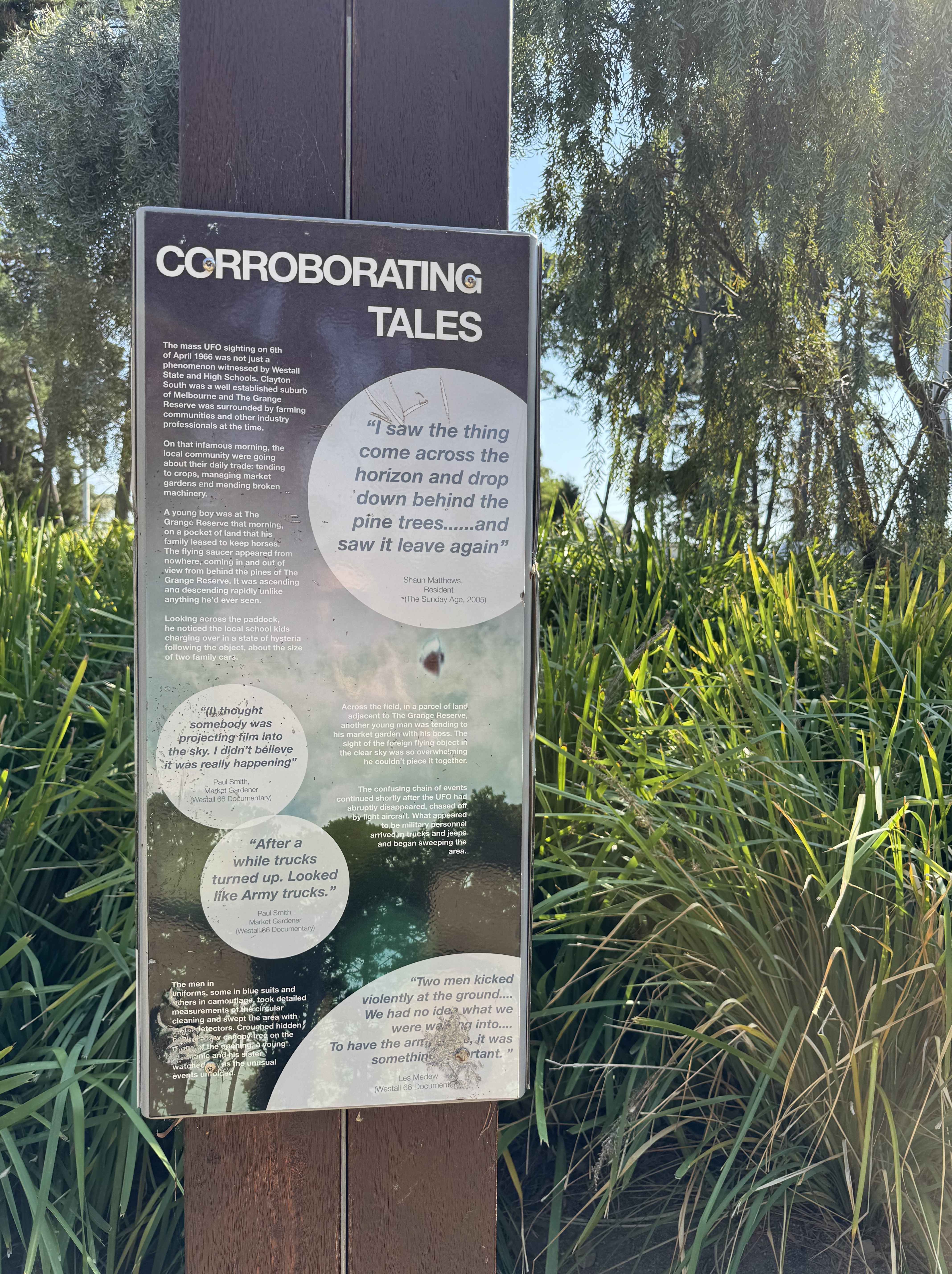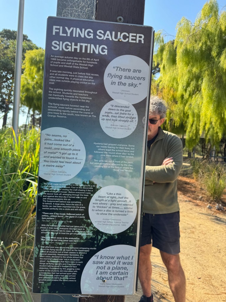 While in Melbourne, Finn was keen for a visit to Westall, an ordinary suburb of Melbourne with an extraordinary story. If, like me, you have never heard of the Westall UFO sightings of 1966, it’s Australia’s most famous UFO sighting with around 100 witnesses, including high school students, teachers and local residents. Read more on the State Library Victoria blog or the Wikipedia entry.