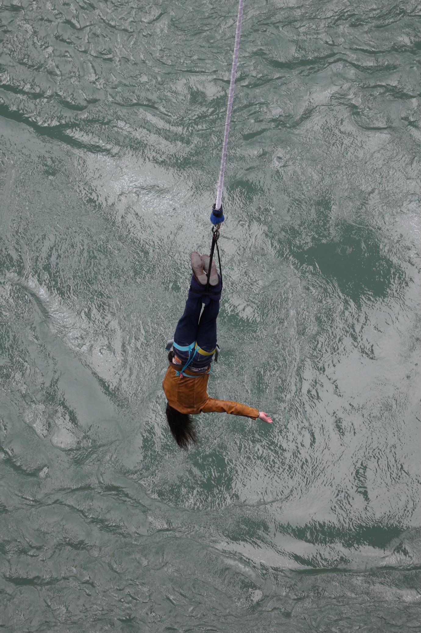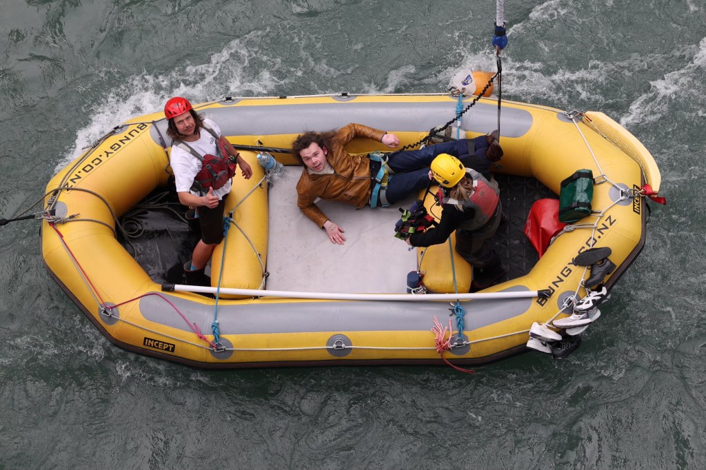Finn almost hits the water with his hair, then recoils on the elastic band a few times. After several high-octane body spins, he steadies, reaches for an extended rod from some guys in an inflatable boat, and is pulled into the vessel. Straight away, Finn looks up at us and gives a reassuring wave. Phew!